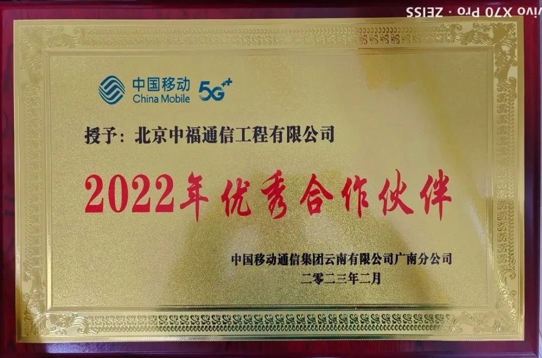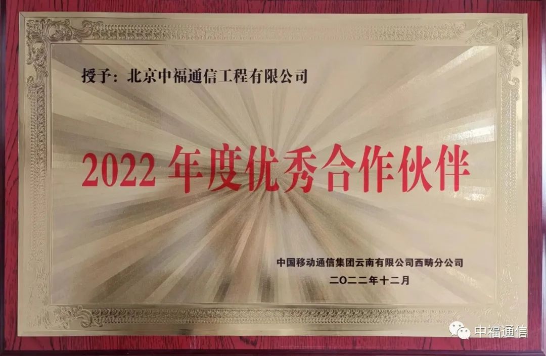 2022年12月,文山項目部在2022年12月獲得了中國移動通信集團云南有限公司西疇分公司及中國移動通信集團云南有限公司廣南分公司頒發(fā)的“2022年度優(yōu)秀合作伙伴”獎牌。